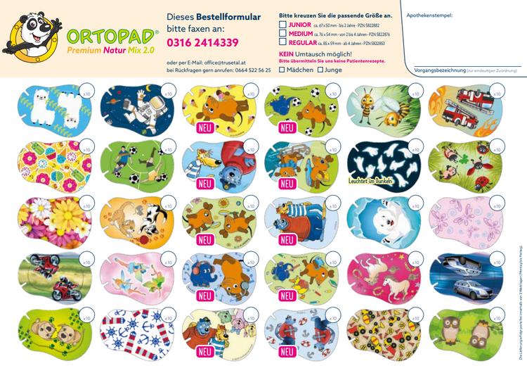 Unsere Augenokklusionspflaster zum individuellen Mischen aus über 60 Motiven mit und ohne Leuchteffekt. Jede Packung ORTOPAD® Mix enthält 100 Augenpflaster und kann aus bis zu 10 unterschiedlichen Motiven Ihrer Wahl zusammengestellt werden (mindestens 10 Pflaster pro Motiv).